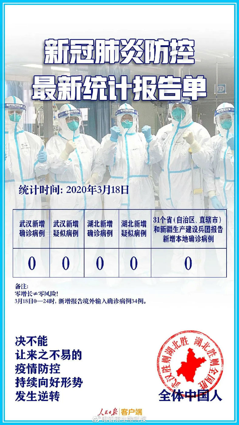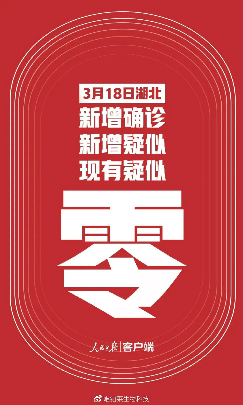 最新消息称,3月19日,湖北全省新增新冠肺炎病例确诊病例0例,新增疑似病例0例,这来之不易的0给武汉甚至全国人民打了一剂定心药,宣示着全国各省的疫情都已经得到控制,中国彻底战胜疫情已经指日可待了!