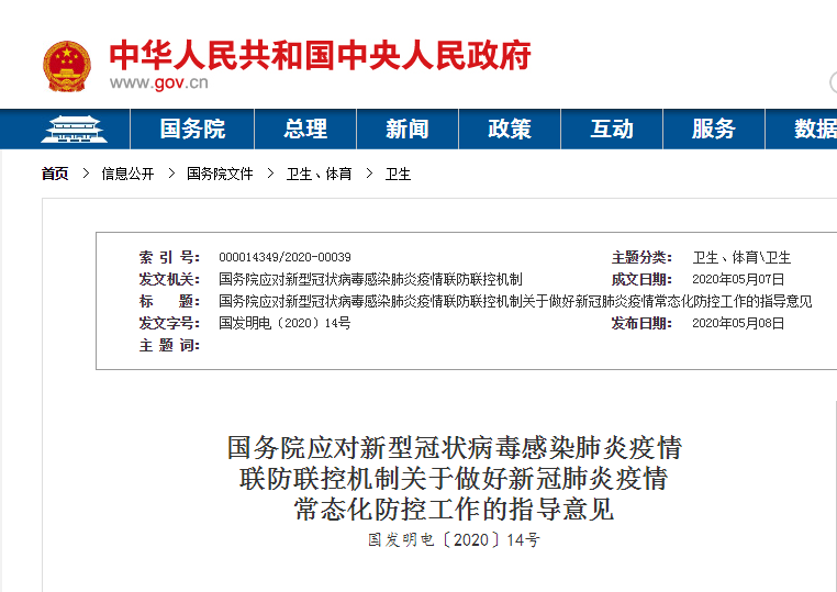 国务院于5月8日新发表了《关于做好新冠肺炎疫情常态化防控工作的指导意见》,文件中明确指出: