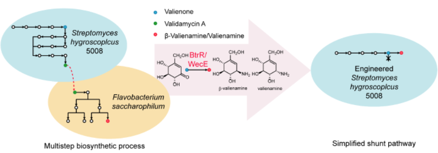 图1 Valienamine天然多步合成途径及改造后的简化合成途径