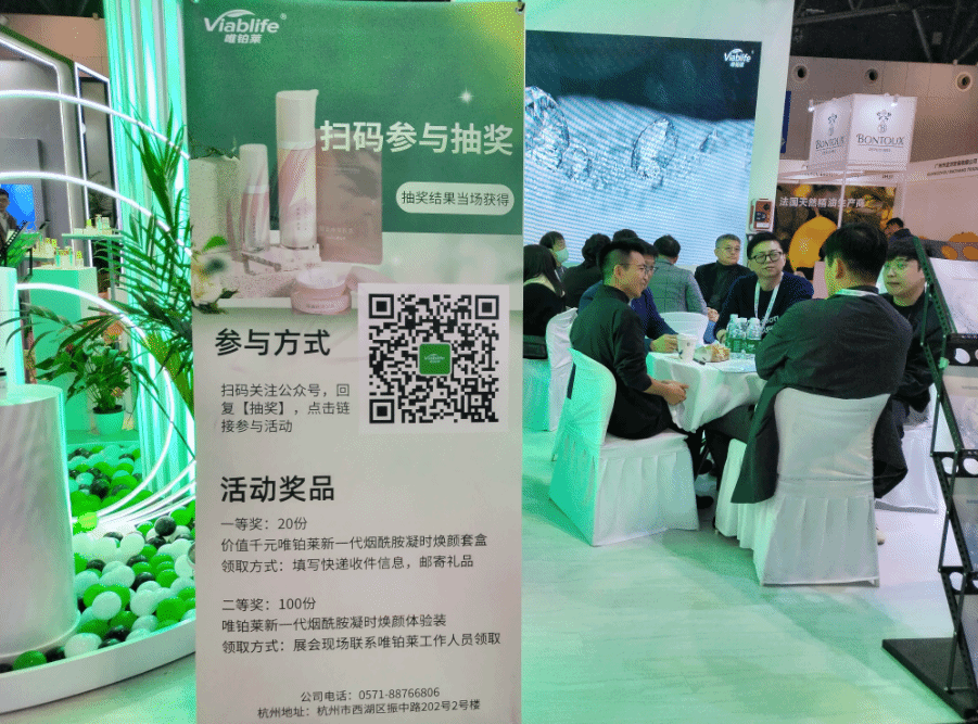 展会现场,抽奖活动也在如火如荼的进行着,现场客户积极扫码参与,抽取DG视讯官网新一代烟酰胺护肤品套装或体验装等礼品。