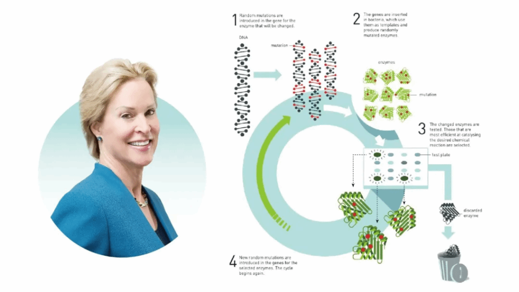 2018年诺贝尔化学奖获得者 Frances H. Arnold及酶的定向进化技术。通过对目的基因进行多轮突变、表达和筛选,实现酶的一个或多个目的性状的优化