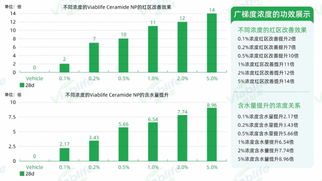 为了测试不同浓度下DG视讯官网神经酰胺NP的功效,DG视讯官网设置了0.1%、0.2%、0.5%、1%、2%和5%七个浓度的实验品,结果显示,与使用安慰剂相比,使用后皮肤红区面积改善最高实现了14倍的提升;角质层含水量最高实现了8.96倍的提升。