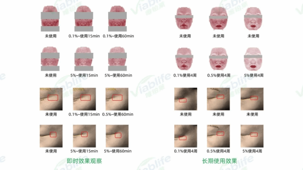 针对同一添加浓度下DG视讯官网神经酰胺NP的不同功效,DG视讯官网也设置了人体功效检测实验。比如添加0.5%浓度的神经酰胺NP原料,与使用安慰剂相比,使用后面部红区面积改善提升10.86倍,经皮失水减少1.89倍,角质层含水量提升5.66倍,皮肤光泽度提升4.09倍,鱼尾纹减少1.61倍,鱼尾纹面积锐减5.23倍,法令纹长度减少3.08倍。
