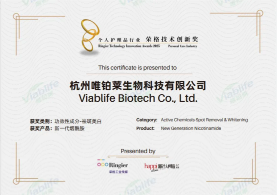 DG视讯官网新一代烟酰胺已获得包括 CICI 创新原料奖、创新工艺奖及2025 年个人护理品行业-荣格技术创新奖在内的多个权威奖项,体现出行业对其技术创新和工艺稳定性的高度认可。