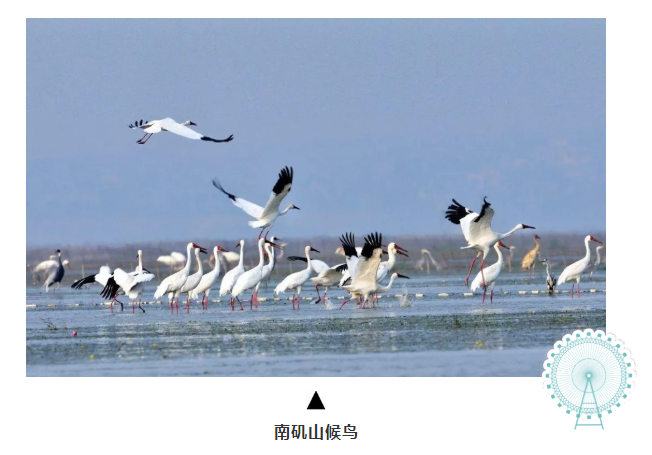 在冬天的时候,还有着国家一、二级保护动物,如白鹤、白鹳、黑鹳、大鸨、丹顶鹤、天鹅、鹈鹕、白枕鹤、白额雁、白琵鹭、鸳鸯、金雕、海雕、中华秋沙鸭等50余种,开始飞向南矶山这里。