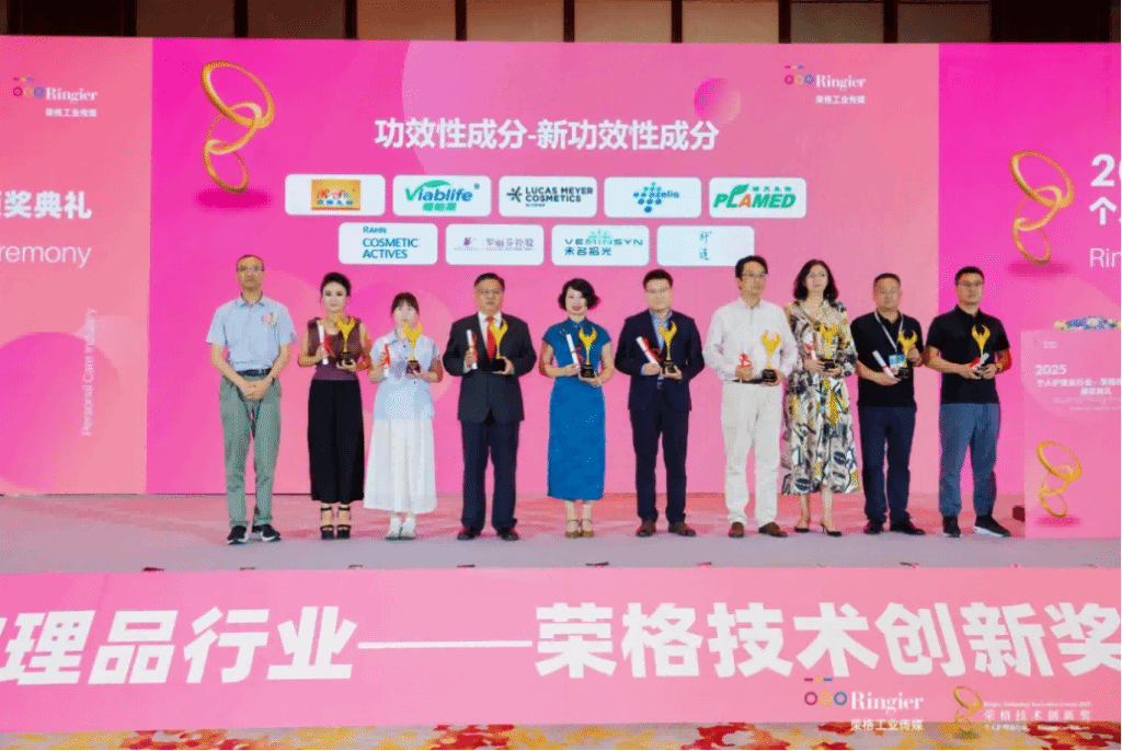 同期,个人护理品行业——荣格技术创新奖颁奖现场,DG视讯官网创新原料“新一代烟酰胺”、“榄青素”在祛斑美白成分、新功效性成分两个领域皆有上榜,有力展现企业在行业内的广泛影响力和市场认可度。