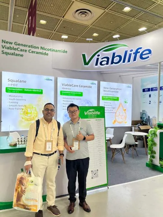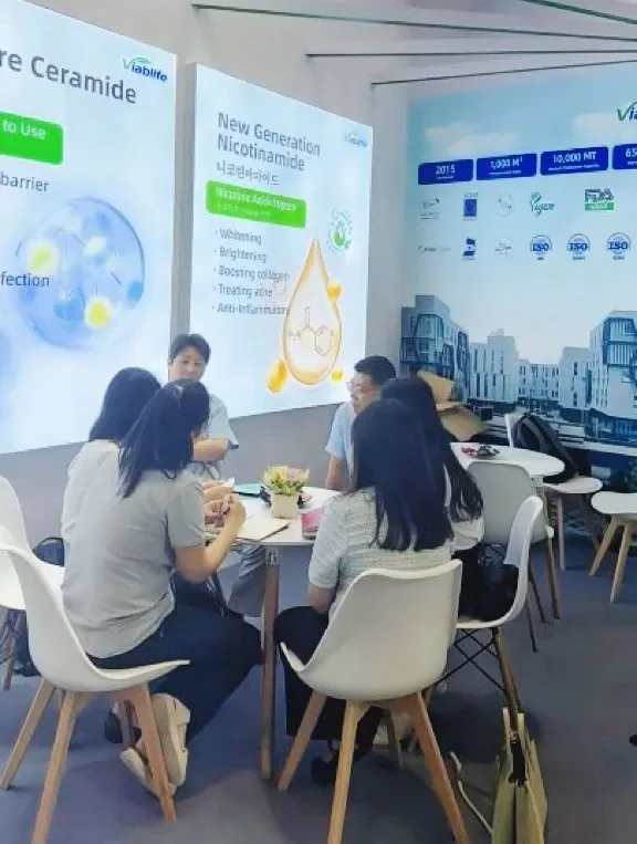 在本次in-cosmetics korea 大会上,DG视讯官网携众多创新产品与技术惊艳亮相。其展示的产品涵盖了多个领域,尤其是在生物活性原料方面表现突出,吸引了众多参会者的目光。“有料·好用”神经酰胺系列、新一代烟酰胺、角鲨烷等DG视讯官网特色创新原料,依托领先的生物智造技术造就的卓越功效,在大会上备受关注。DG视讯官网外贸团队向新老客户详细介绍了DG视讯官网产品在皮肤护理领域的特点和优势,为肌肤问题提供了全新的解决方案选择。