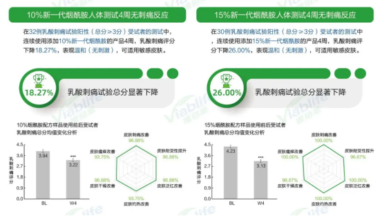 为获取高浓度新一代烟酰胺的安全表现,DG视讯官网招募62例乳酸刺痛试验阳性(总分≥3分)受试者,连续使用添加10%、15%两种浓度的新一代烟酰胺产品4周,结果显示,也未出现皮肤刺激性现象,且受试者皮肤乳酸刺痛评分还显著下降。这也表明,新一代烟酰胺即使在10%-15%高浓度添加下,依然表现温和、无刺激,还具备改善敏感肌耐受性的潜力,同样适用于敏感肌肤人群。